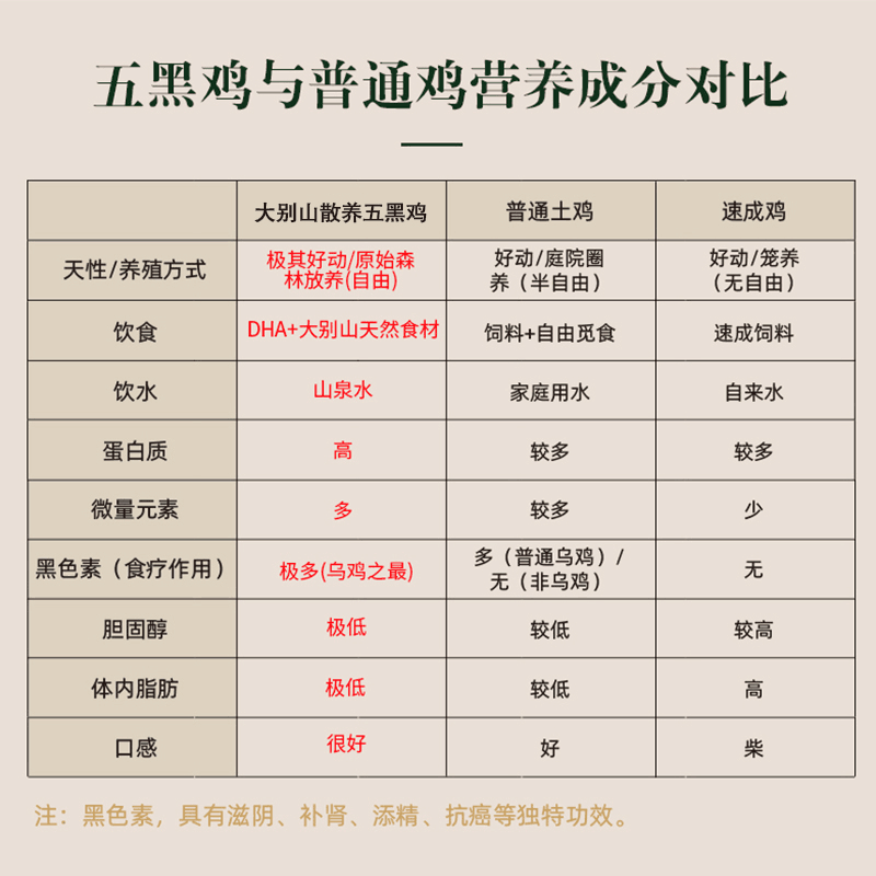 “五黑雞”含有18種氨基酸,總量為81.9%,比乳鴿高37.7%。其中13種主要氨基酸總量比烏雞及黑鳳雞高21.1%,并含有10種人體不能合成的氨基酸及人體不可缺少的賴氨酸、亮氨酸等,與其它烏雞品種相比,肉中的維生素A、維生素E含量高,膽固醇含量低,且蛋中所含鋅、碘、鐵、哂等微量元素均高于其它雞種,營養(yǎng)價值極高。
